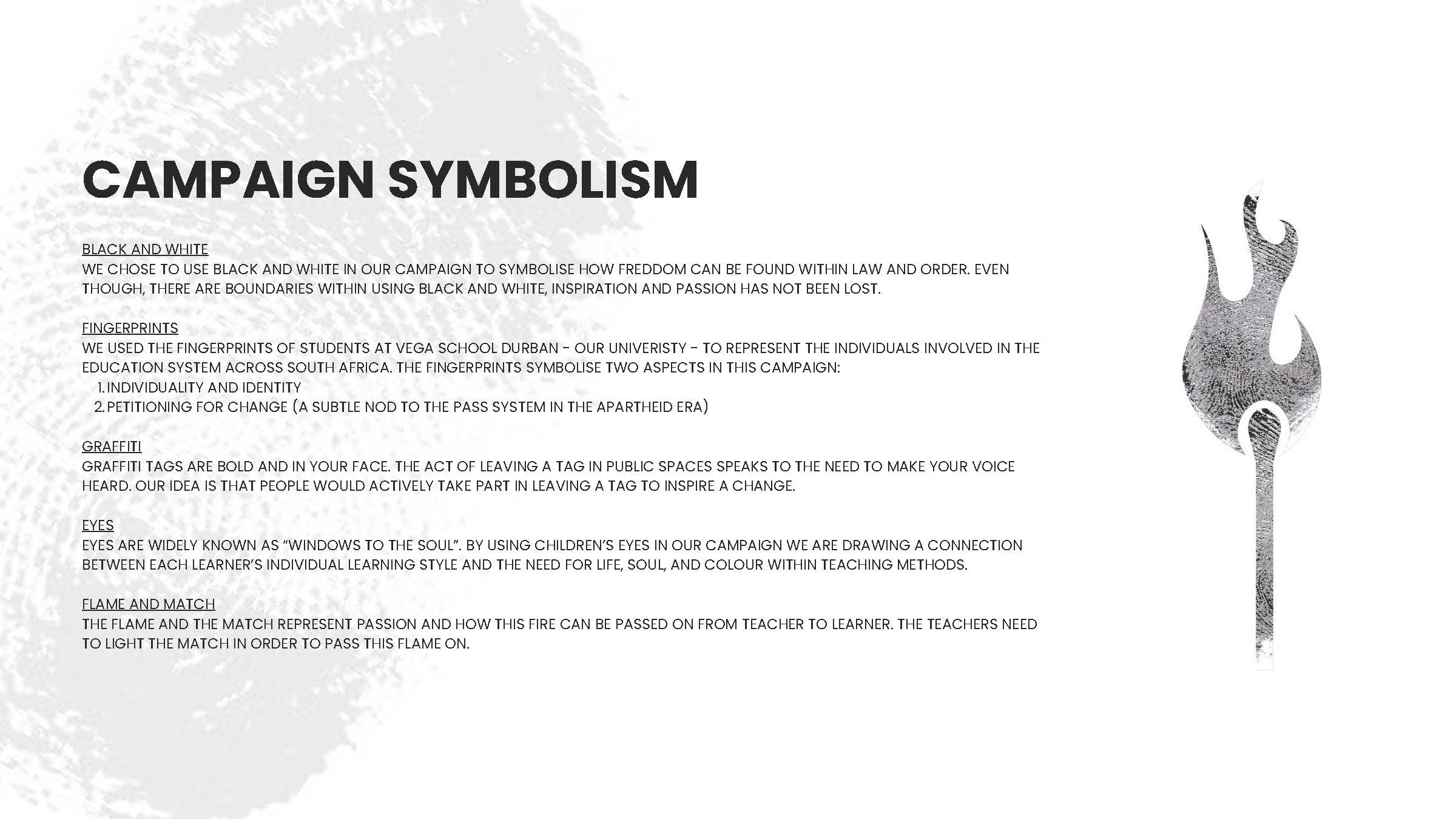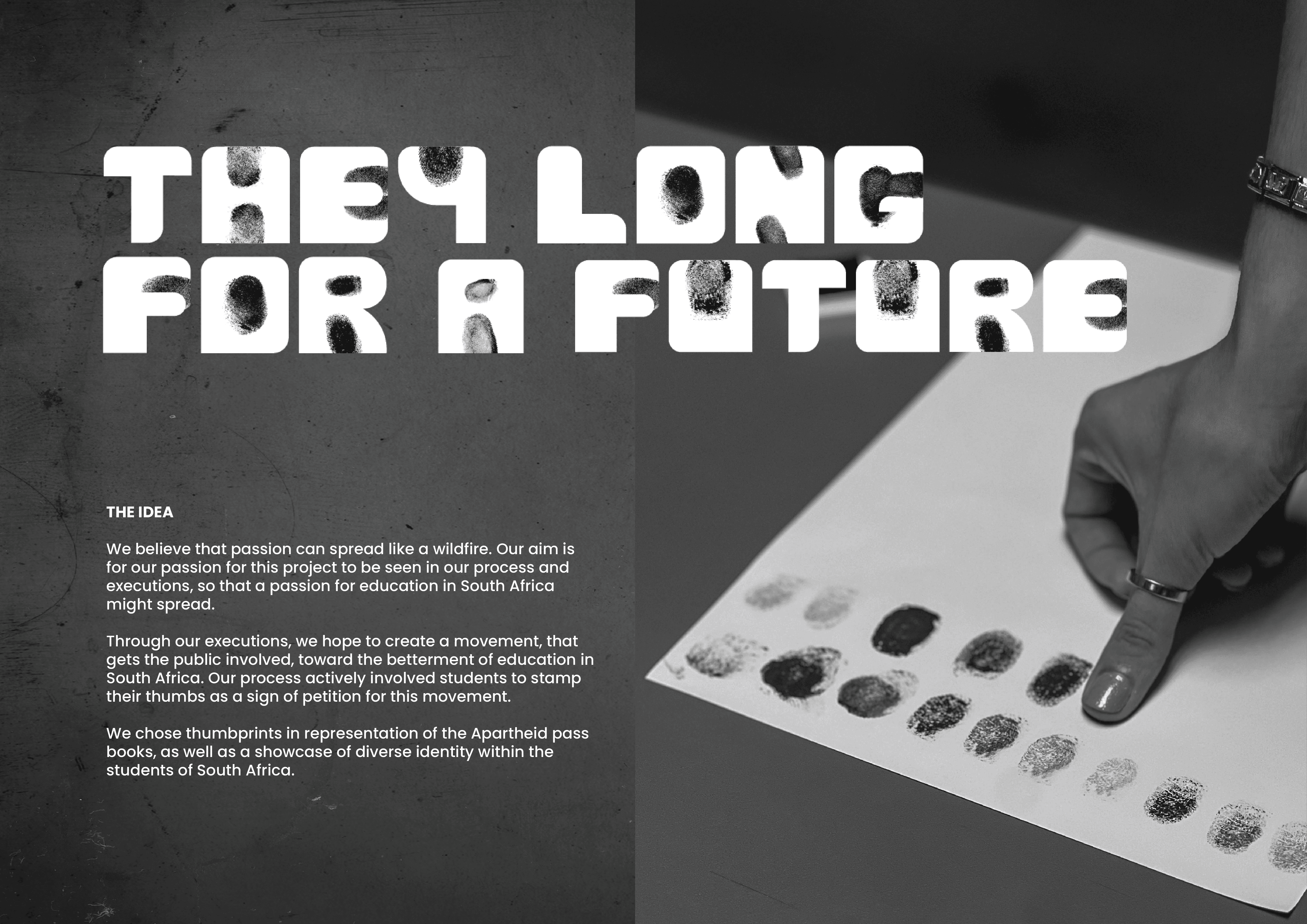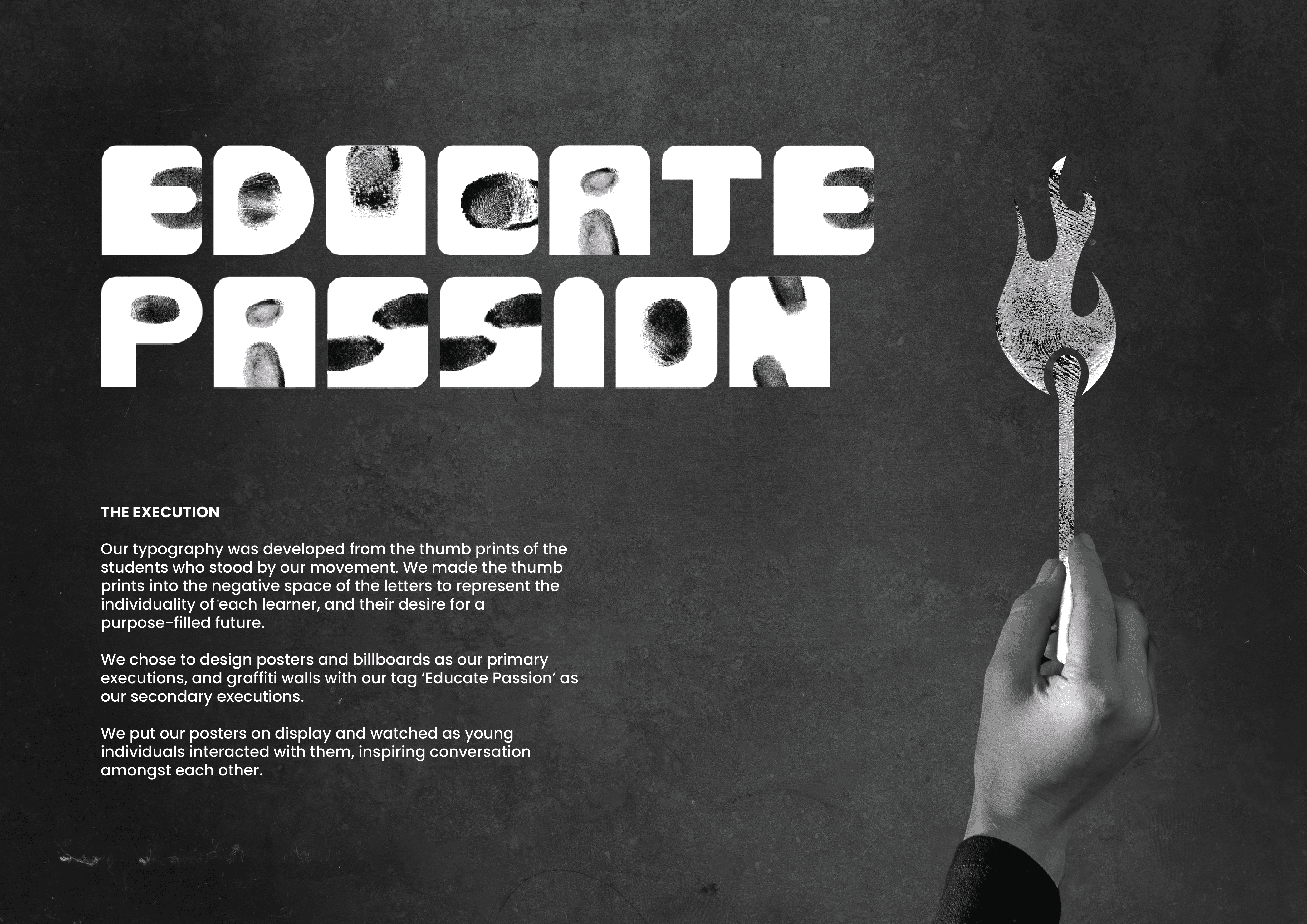 Educate Passion is a campaign that aims to create awareness about the disparity and lack of passion within the education system in South Africa. The typographic based executions are littered with symbolism, especially through the fingerprints representing individuality, as well as a petition. This group project was awarded Bronze by Creative Conscience in 2025.