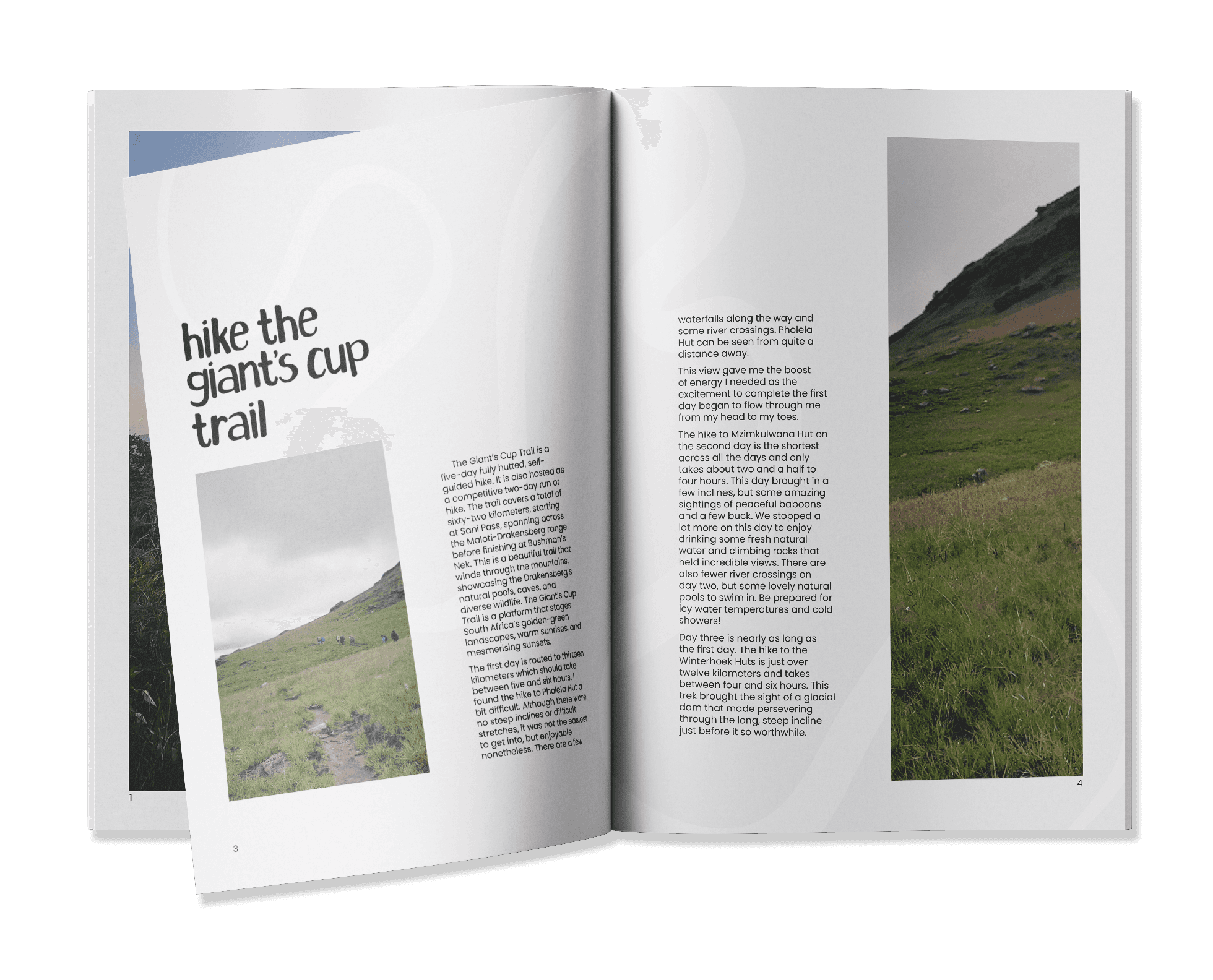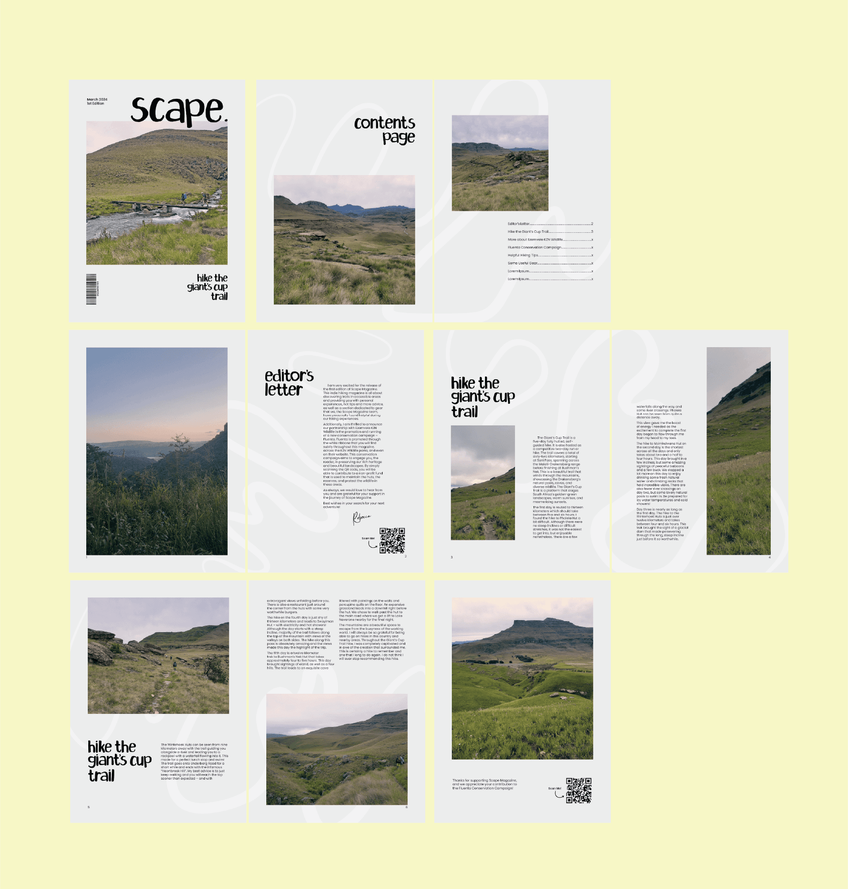 Scape Magazine is an indie hiking magazine. This magazine was designed with a hand-rendered font, personally shot photographs, and journalised entries. This magazine paints a picture of the beauty I see when I spend a week hiking through the mountains. Scape Magazine shows how one can escape to the landscape to find peace and tranquility.